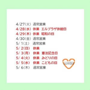 大型連休及びエルプラザの全館休館により、下記の期間、ここシェルジュSAPPOROは休業とさせていただきます。